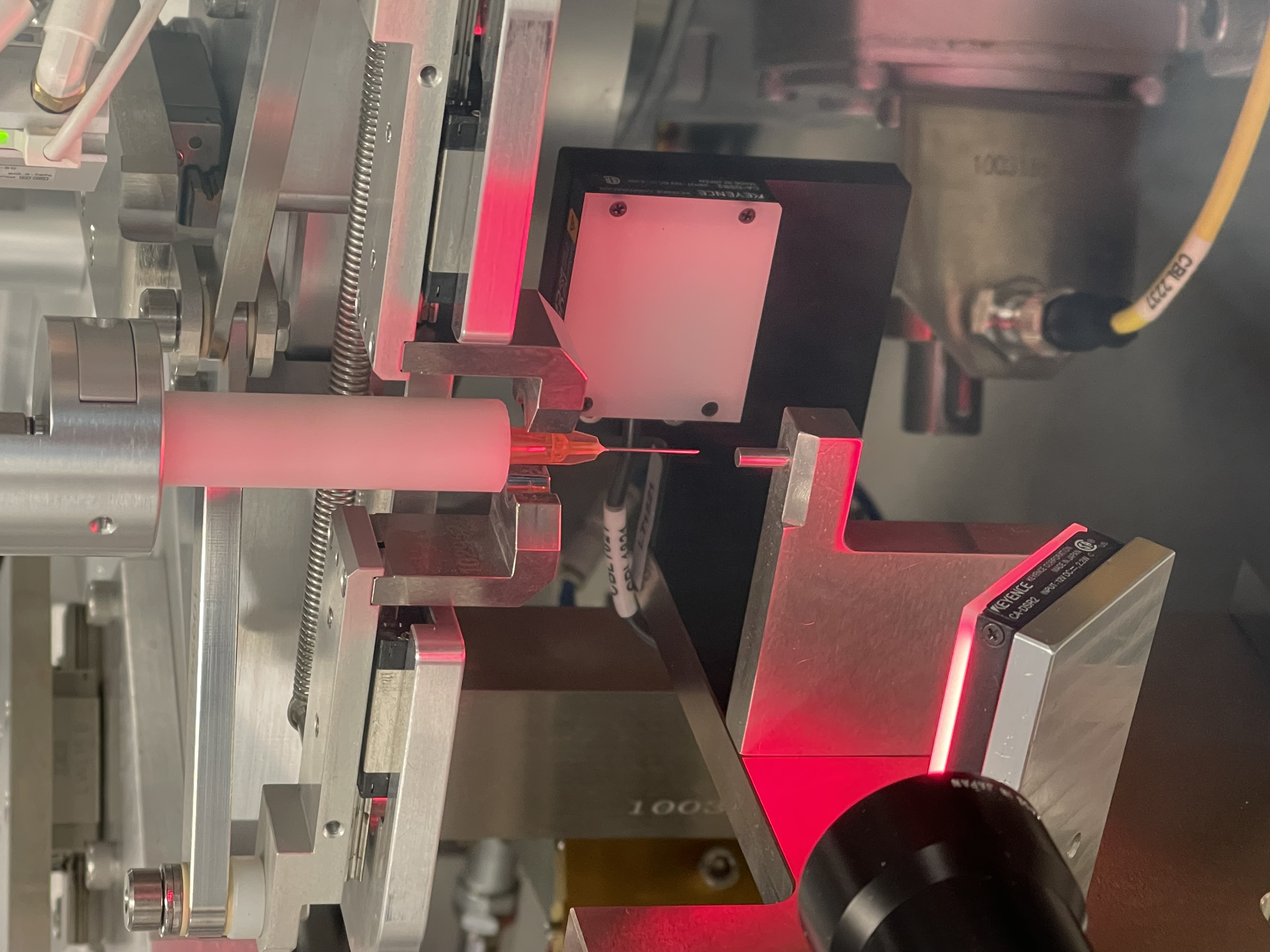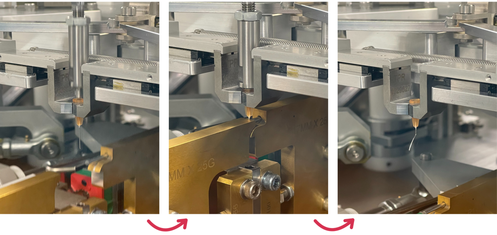 A built-in camera inspects the bent tip to verify that it meets the specified measurements. Cannulas that fall outside the defined tolerance are automatically marked for rejection at the final station.